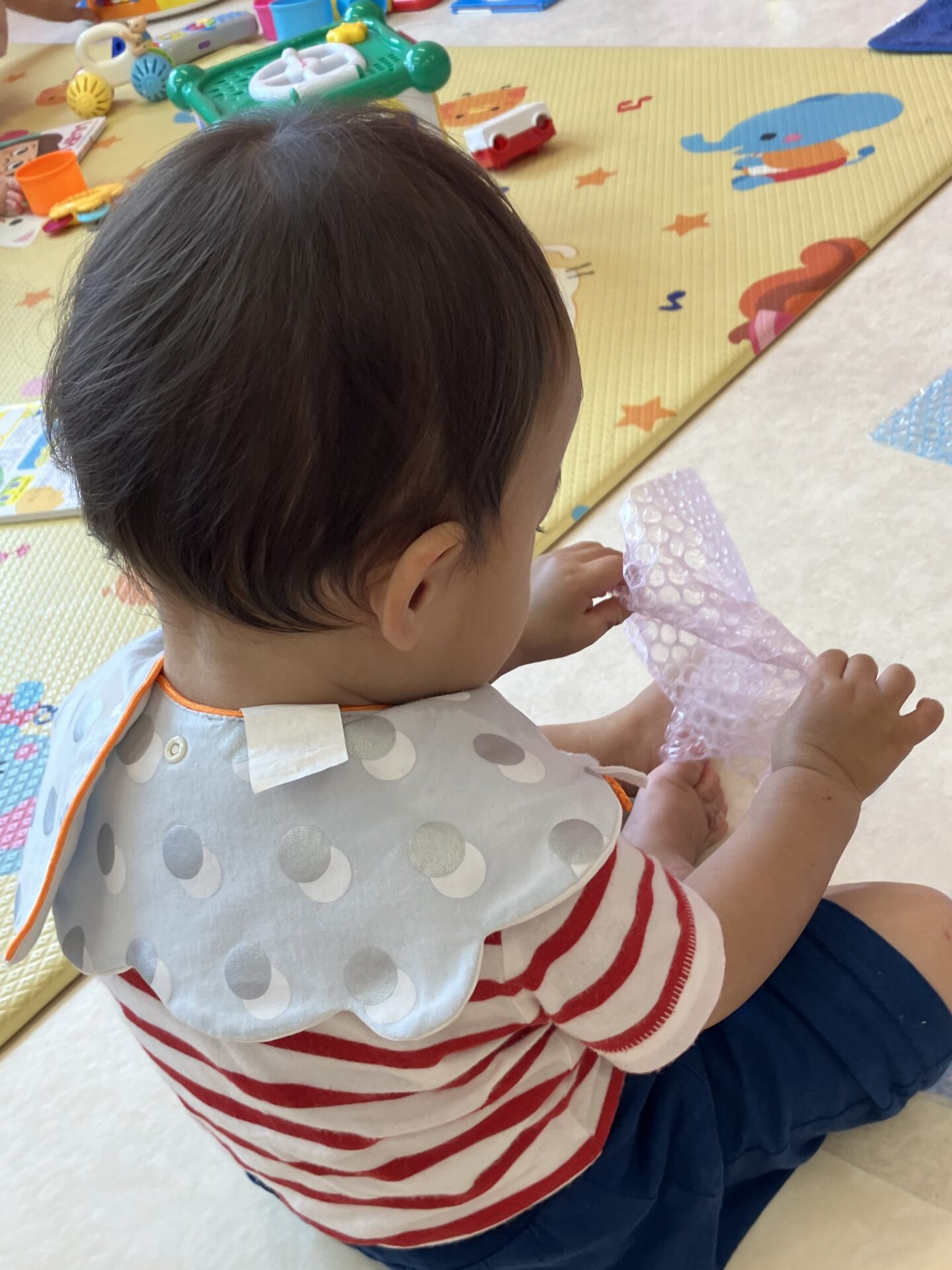 初めて見る衝撃緩衝材のプチプチに初めは様子を伺っていたどれみ組さん。先生が遊ぶ姿を見て少しづつ慣れると握ったり、頭に乗せたり…独特な感触を自由に楽しんでいました。