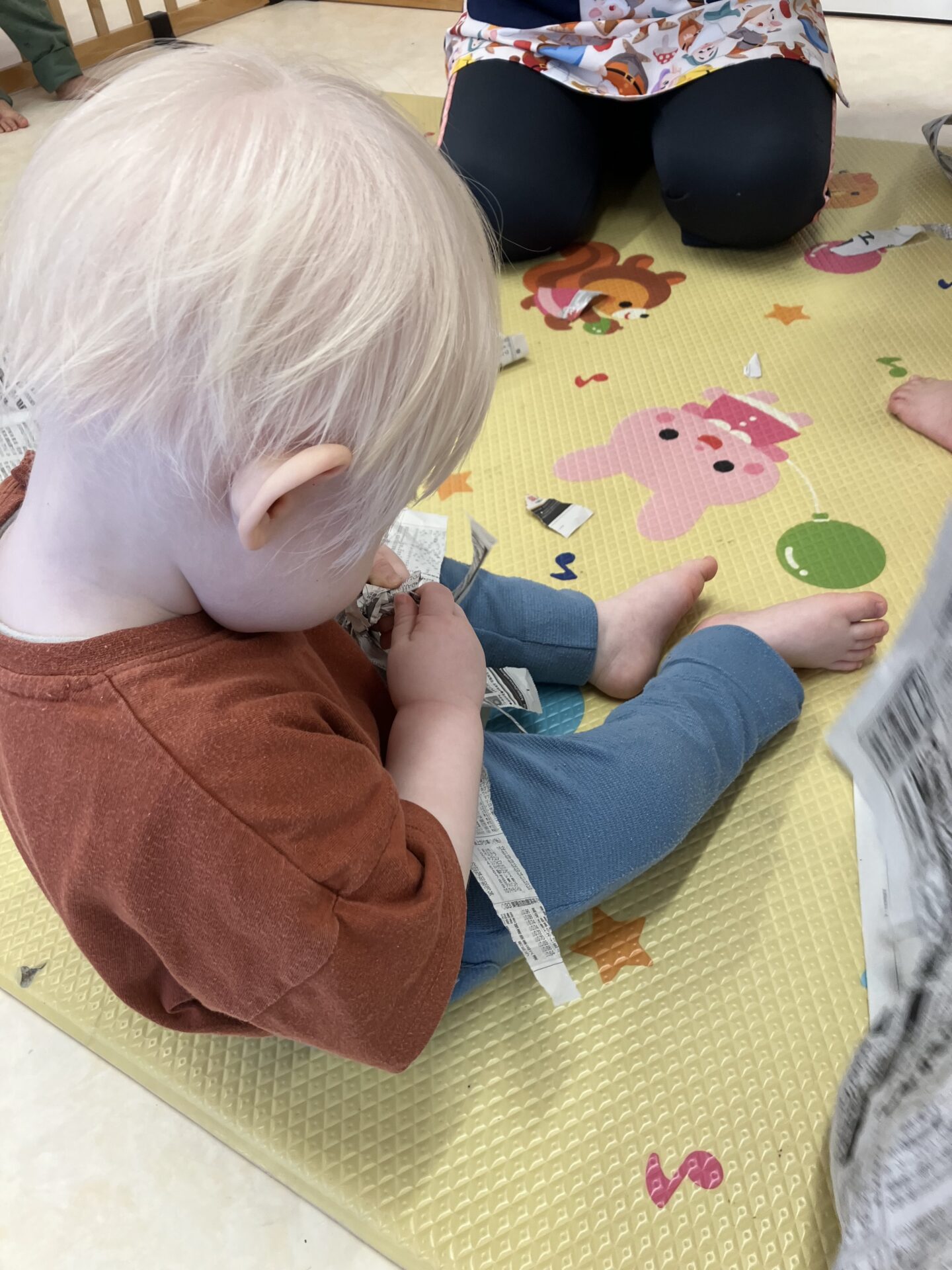 かなで組さんや先生が細長くちぎった新聞紙を振ってリボンのように動かしたり、細かくちぎって先生に見せてくれたりして楽しみました。