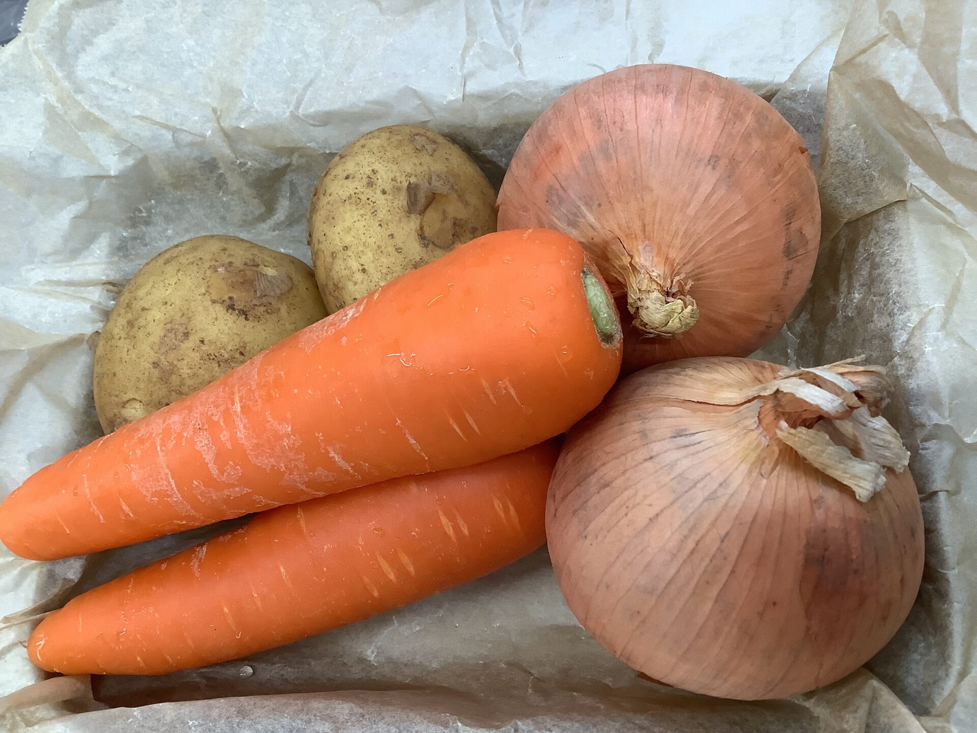 材料は、シンプル。にんじん じゃがいも たまねぎ お肉です。