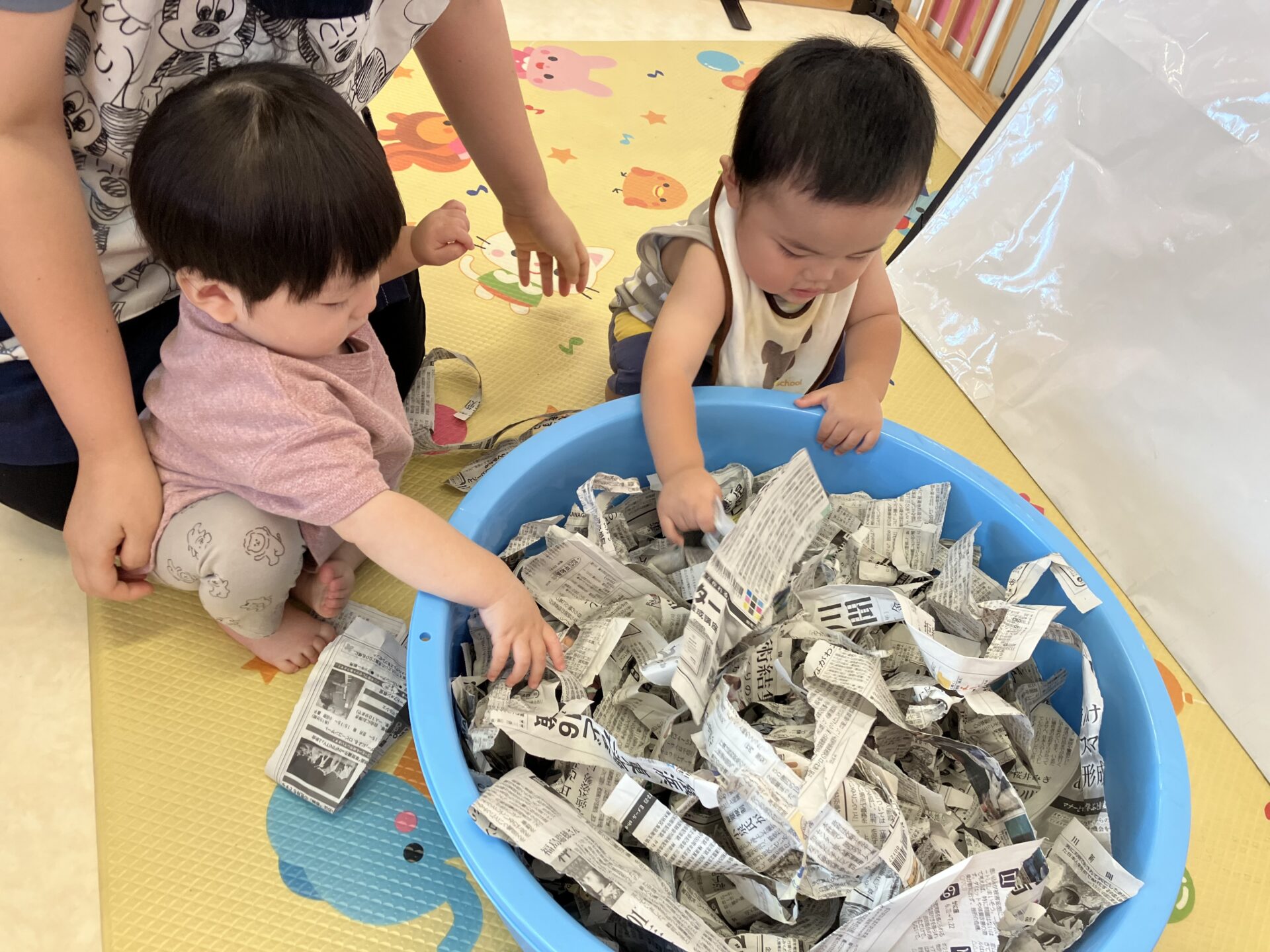 新聞紙の中からお星様を探す「星探しゲーム」をおんぷ組さんから順番にスタート!
