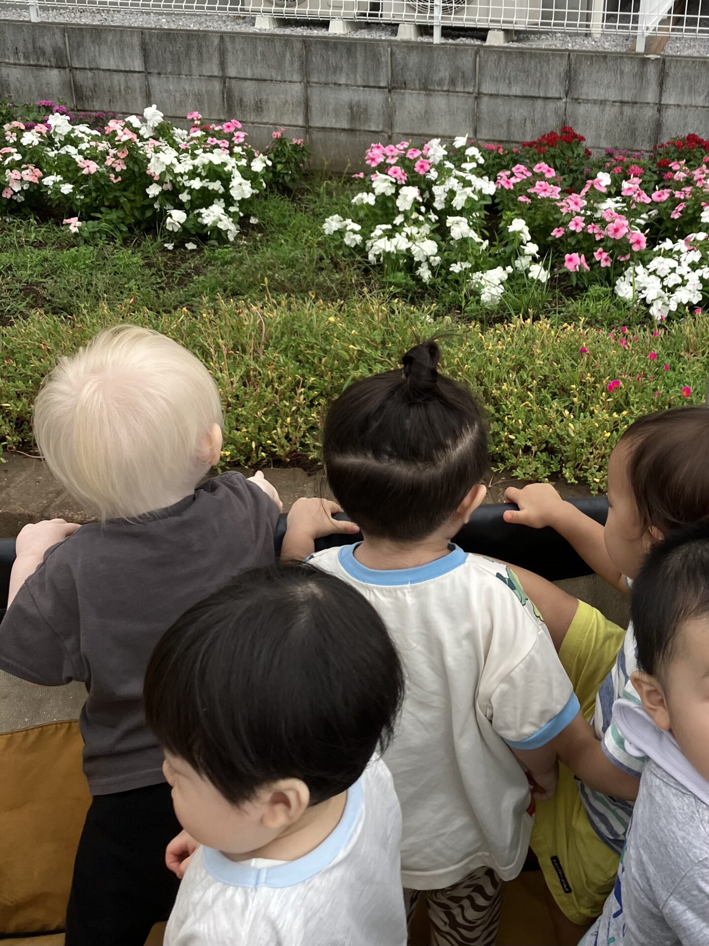 おんぷ組さん、どれみ組さんはバギーに乗って夏から秋に変わってきた風を感じながら保育園近くの公園でお花を見たり、近くの道路を走る車を見て楽しみました。