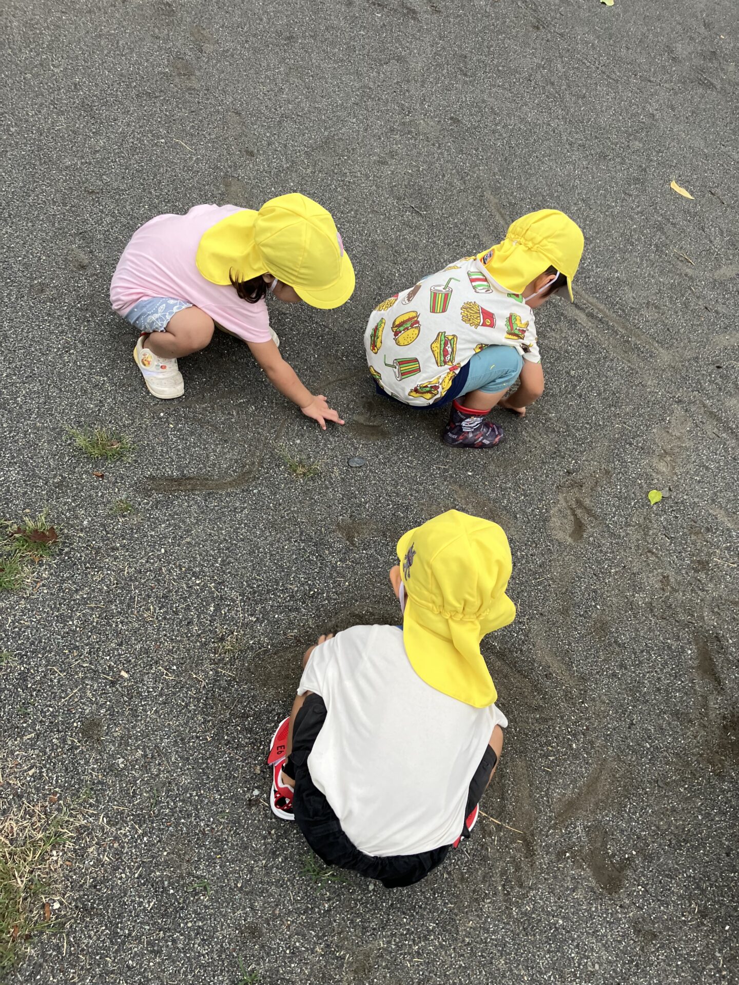 お友達と一緒に砂の感触を楽しみながら「ぼく、〇〇描いたんだ!」と広々とお絵描きを楽しみました。