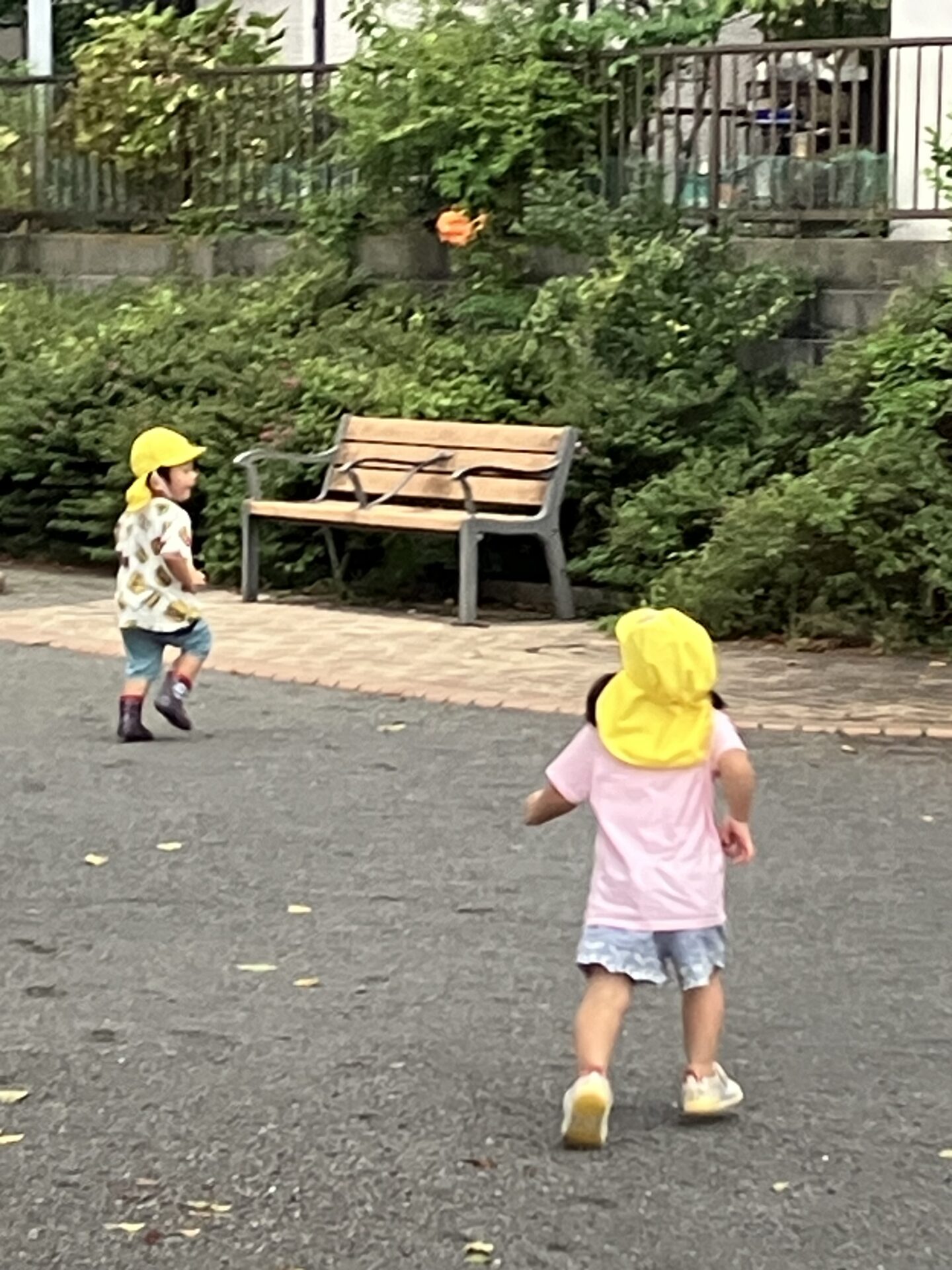 かなで組さんは元気いっぱいにお友達と一緒に砂場の縁でバランスを取りながら歩いたり、かけっこをして身体を動かしたり、バギーに乗っているおんぷ組さんやどれみ組さんの頭を撫でる優しい一面も見せてくれました。