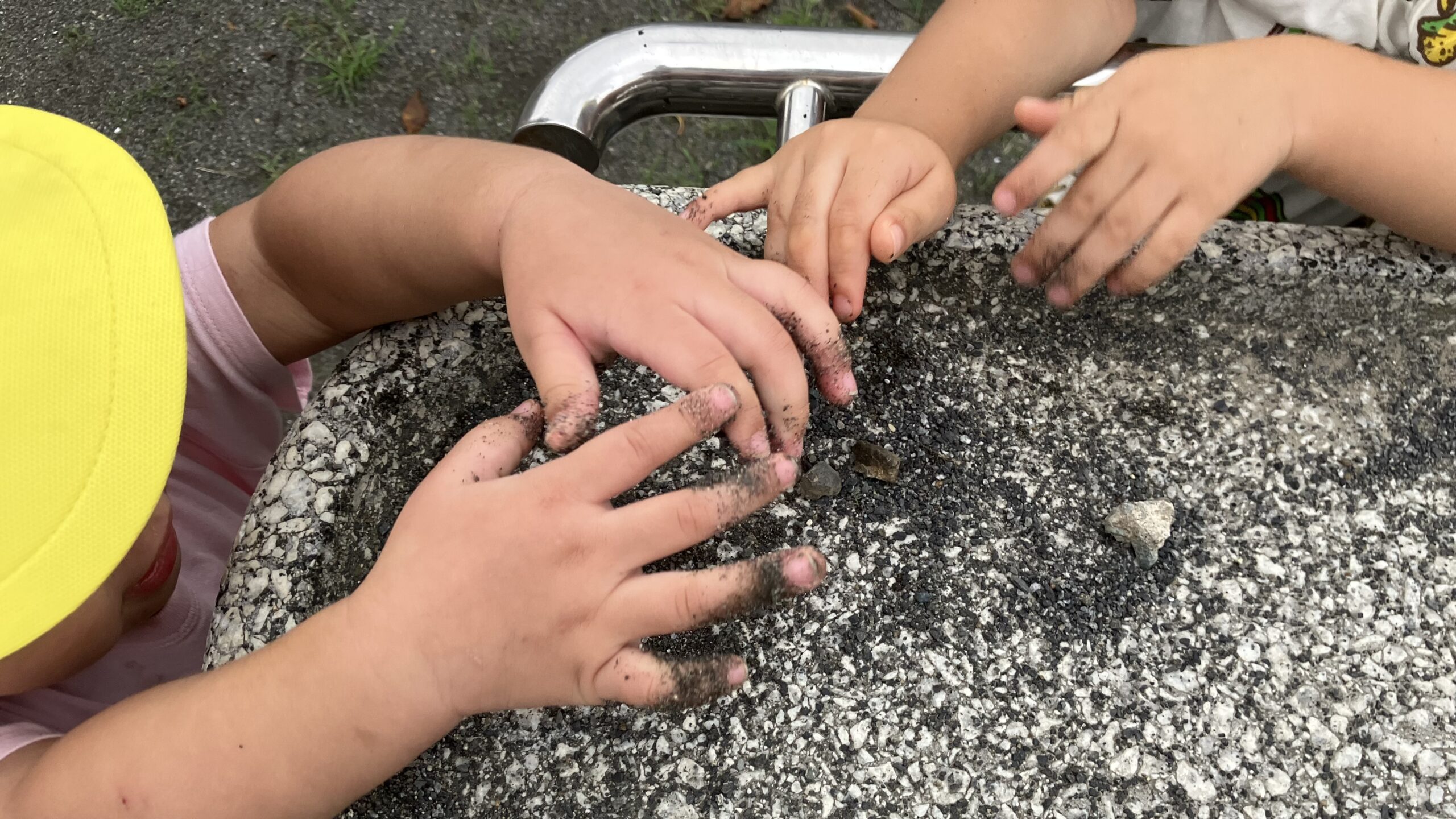水道では小石や砂を集めて、最近かなで組さんでブームになっている「めんめん作り」を楽しみました。