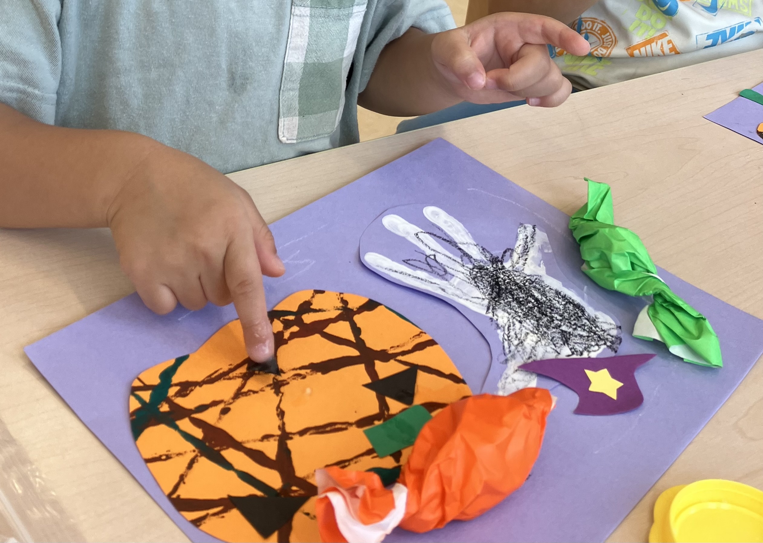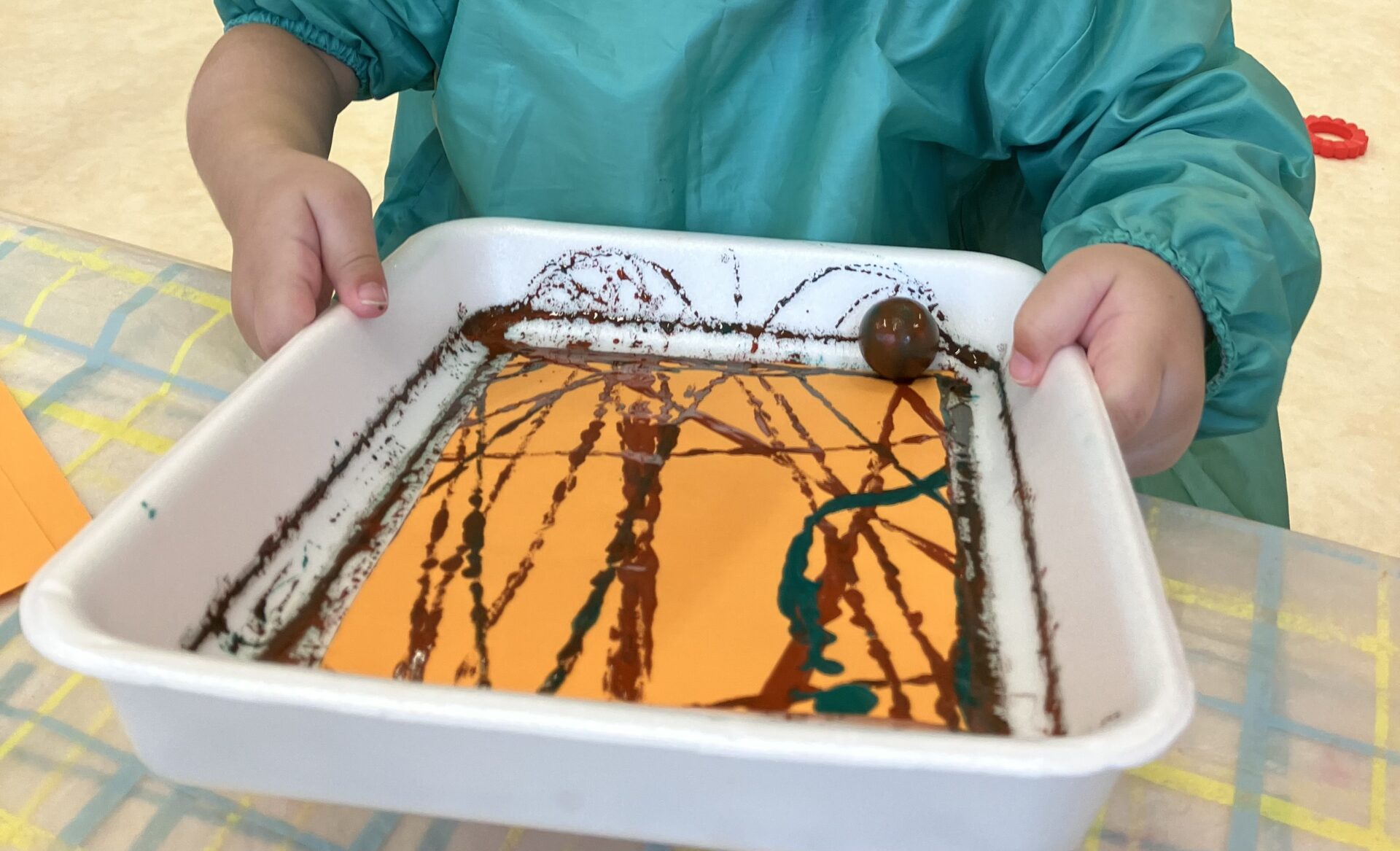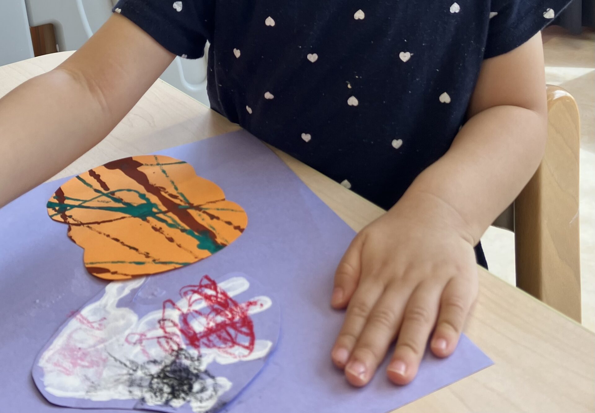 絵の具で模様をつけてかぼちゃを表現しました。初めは、どう転がしたら良いか迷っているお友達もいましたが…やり方を掴むと夢中で転がすことを楽しんでできました。