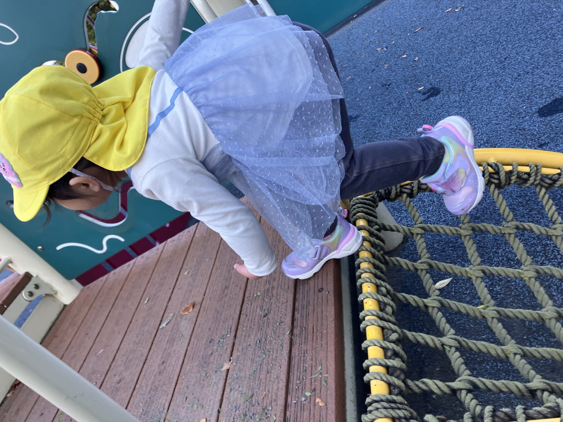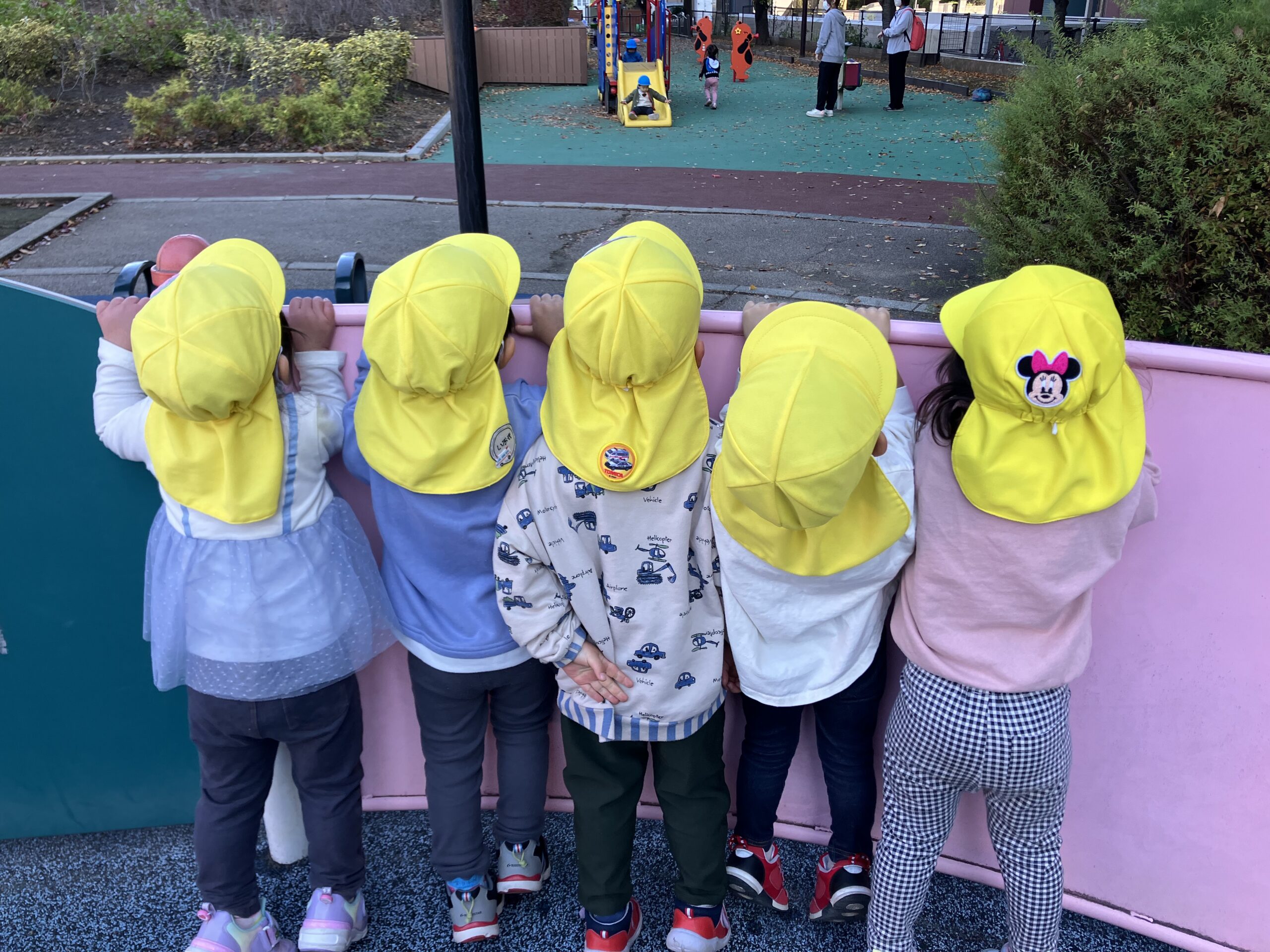 公園では、滑り台や網のロープの遊具など空ぞれがしたい遊びを楽しんでいました。友達とやり取りをしながら、ごっこ遊びをしたり好きなキャラクターになりきりながら、変身することを楽しんだりと思いっきり遊ぶ姿が見られました。