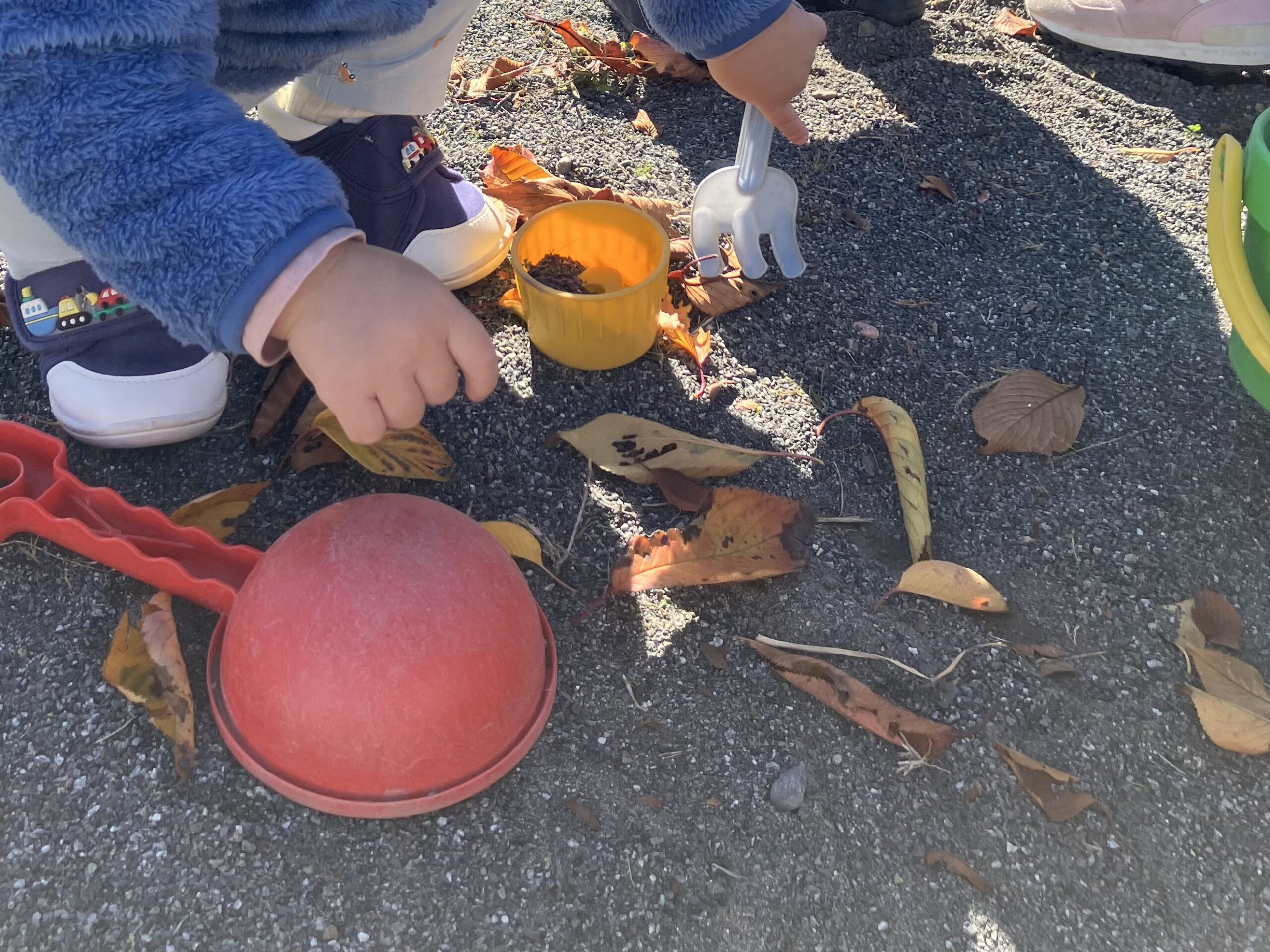 公園に到着すると落ち葉がたくさん落ちていて、風に吹かれて公園内を動く落ち葉と追いかけっこをしたり、は砂場セットのスコップやカップを使って落ち葉や砂を集めて楽しみました。