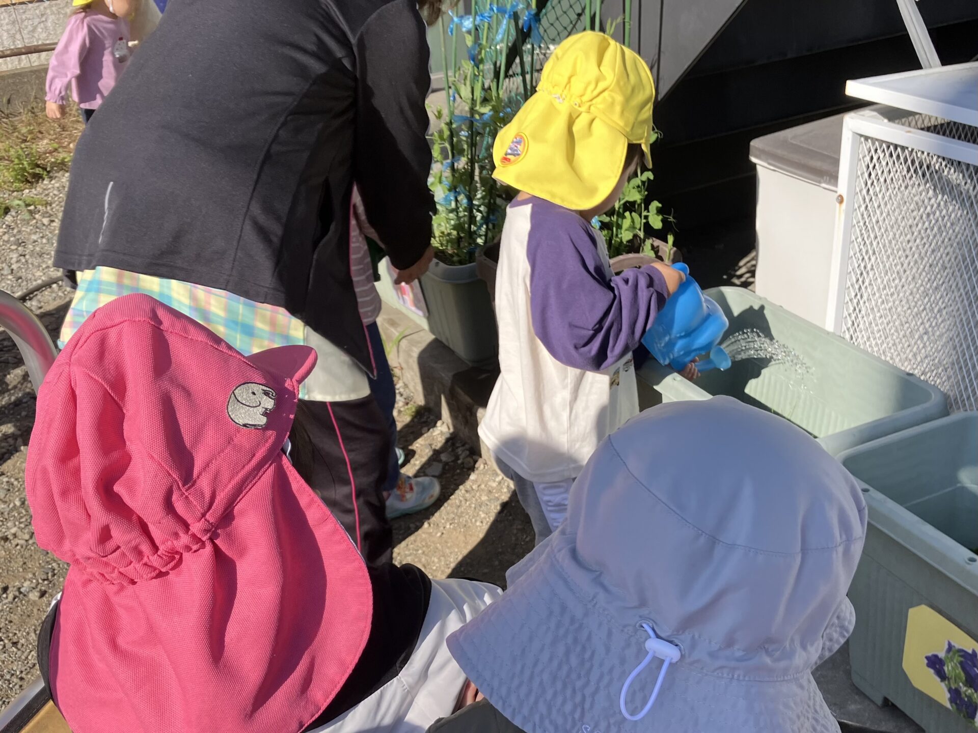 みんな、かなで組さんの水やりに興味津々でジーッと眺めたり、ジョウロから流れるお水に触ってみました。