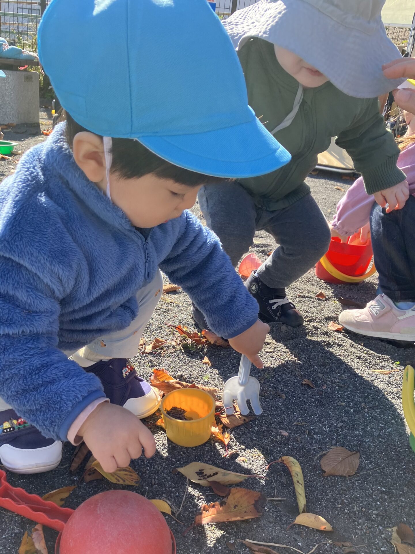 公園に到着すると落ち葉がたくさん落ちていて、風に吹かれて公園内を動く落ち葉と追いかけっこをしたり、は砂場セットのスコップやカップを使って落ち葉や砂を集めて楽しみました。
