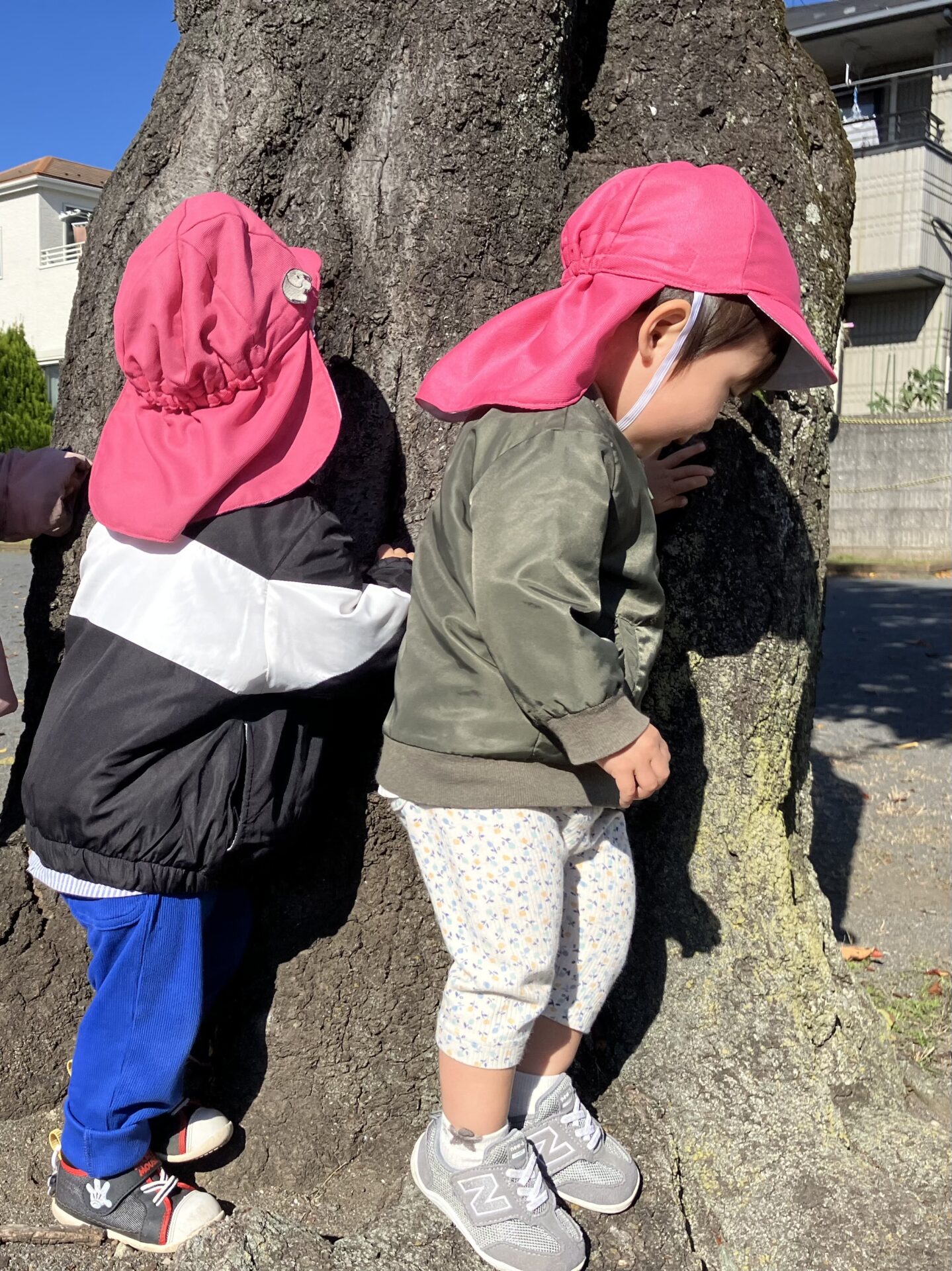 公園に植っている一本の桜の木の根元を、お友達と一緒にバランスをとりながらぐるぐる回って楽しむ子もいました。