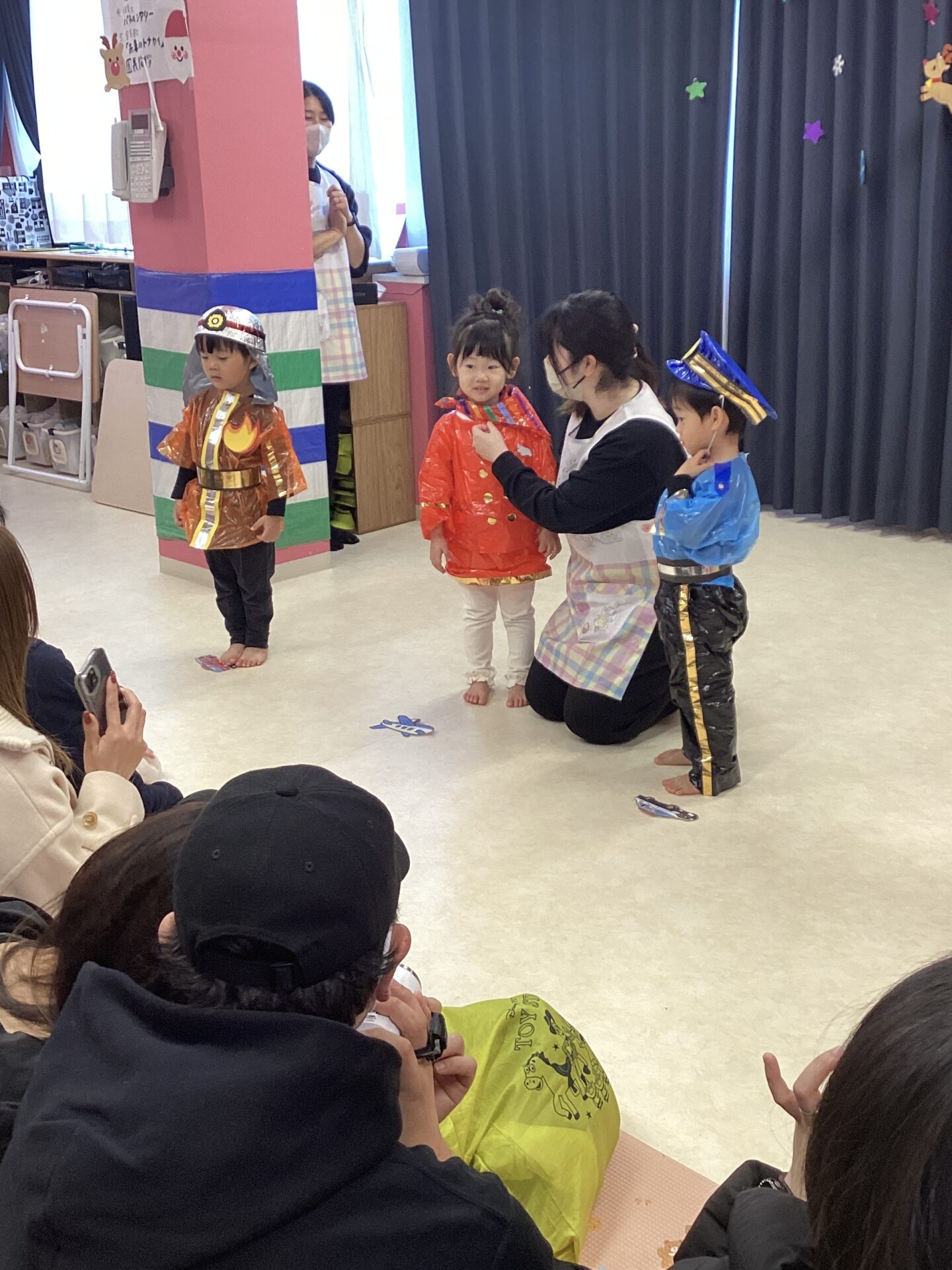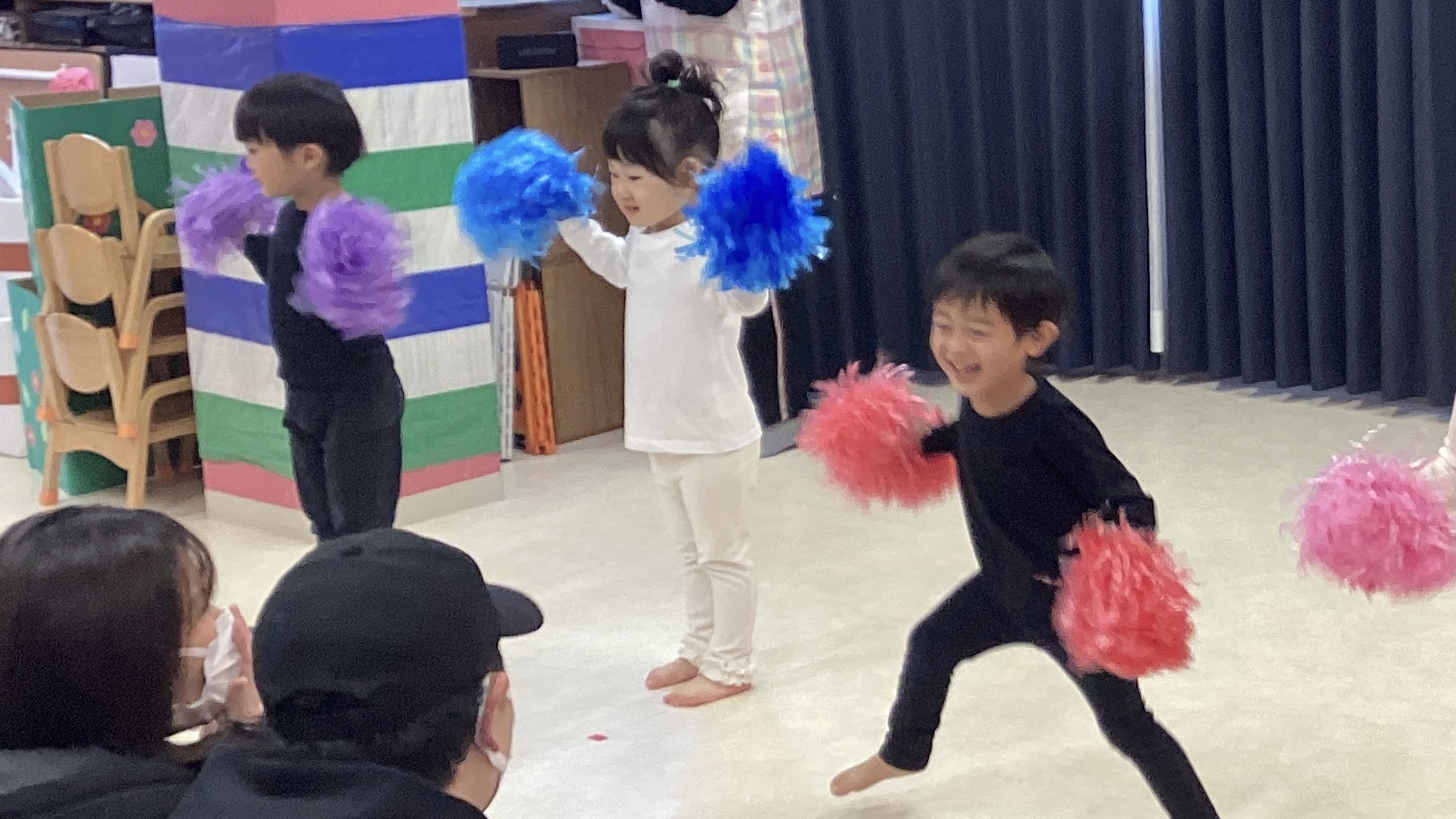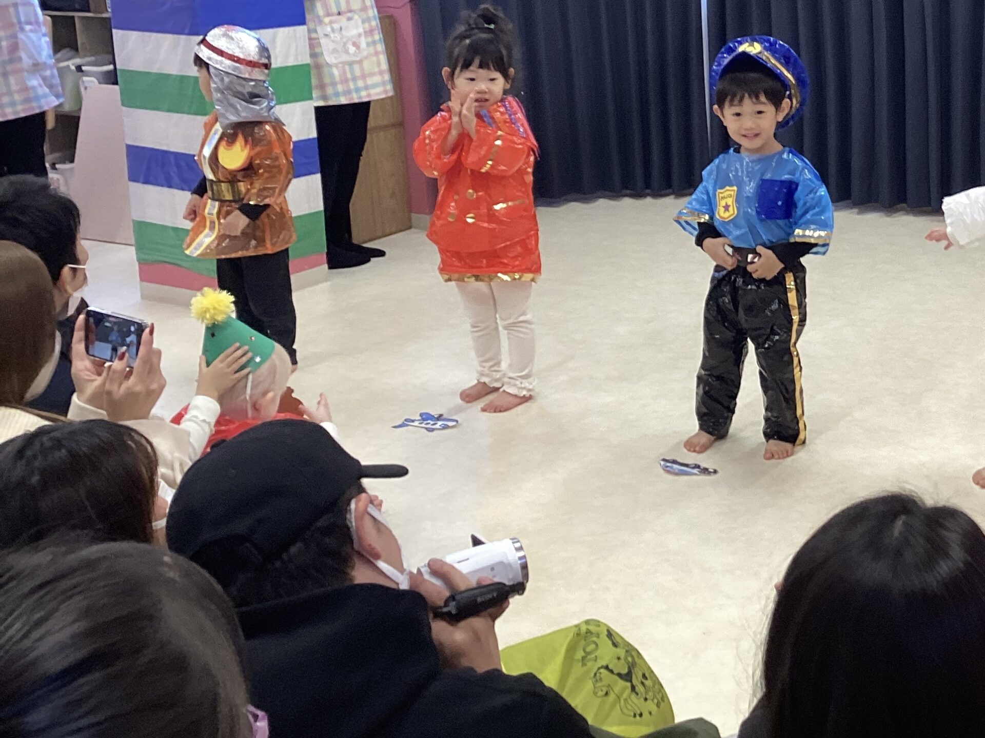 練習の時は、元気いっぱい大きな声で答えてくれてた子どもたちでしたが、本番ではたくさんのお客さんを目の前にして緊張で答えられなかったり、小さな声になっていました。それでも、最後のご挨拶までよく頑張っていてかっこよかったです。