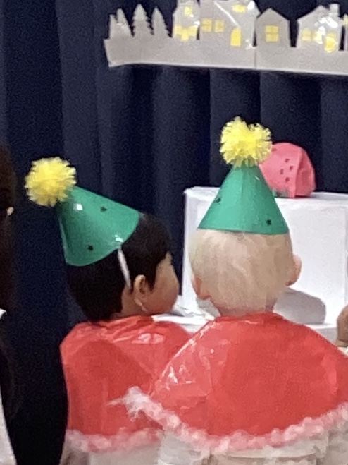 どれみ組さんとおんぷ組さんの「クリスマスケーキを作ろう」では、どれみ組さんは小人に、おんぷ組さんは天使に変身!