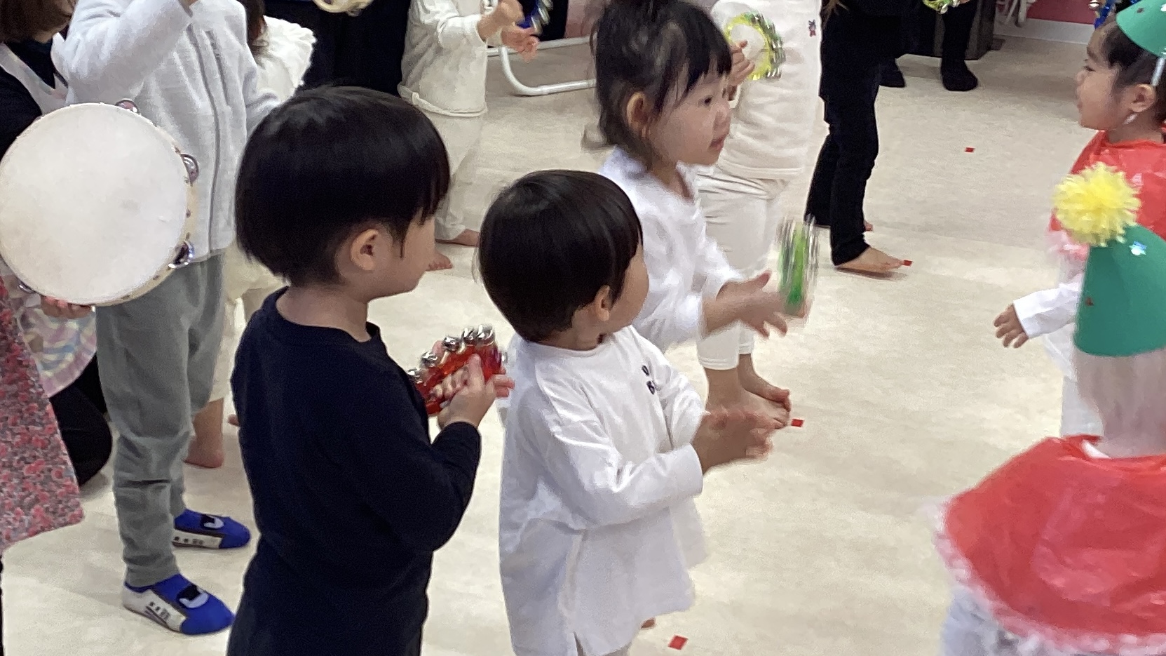 最後は見にきていた園児のお兄ちゃん・お姉ちゃんも一緒に前に出て、みんなで鈴やタンバリンを持って赤鼻のトナカイを歌いました。