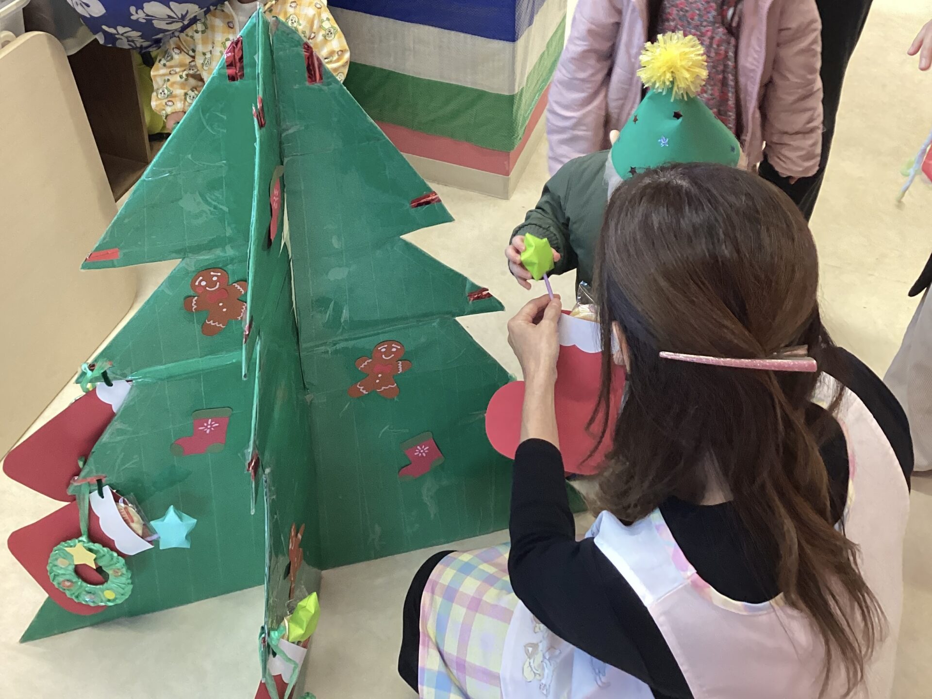 その後は保護者の皆さんも一緒にクリスマスケーキの手遊びや、糸巻きの手遊びで小人の帽子や天使の羽を作って楽しみました。