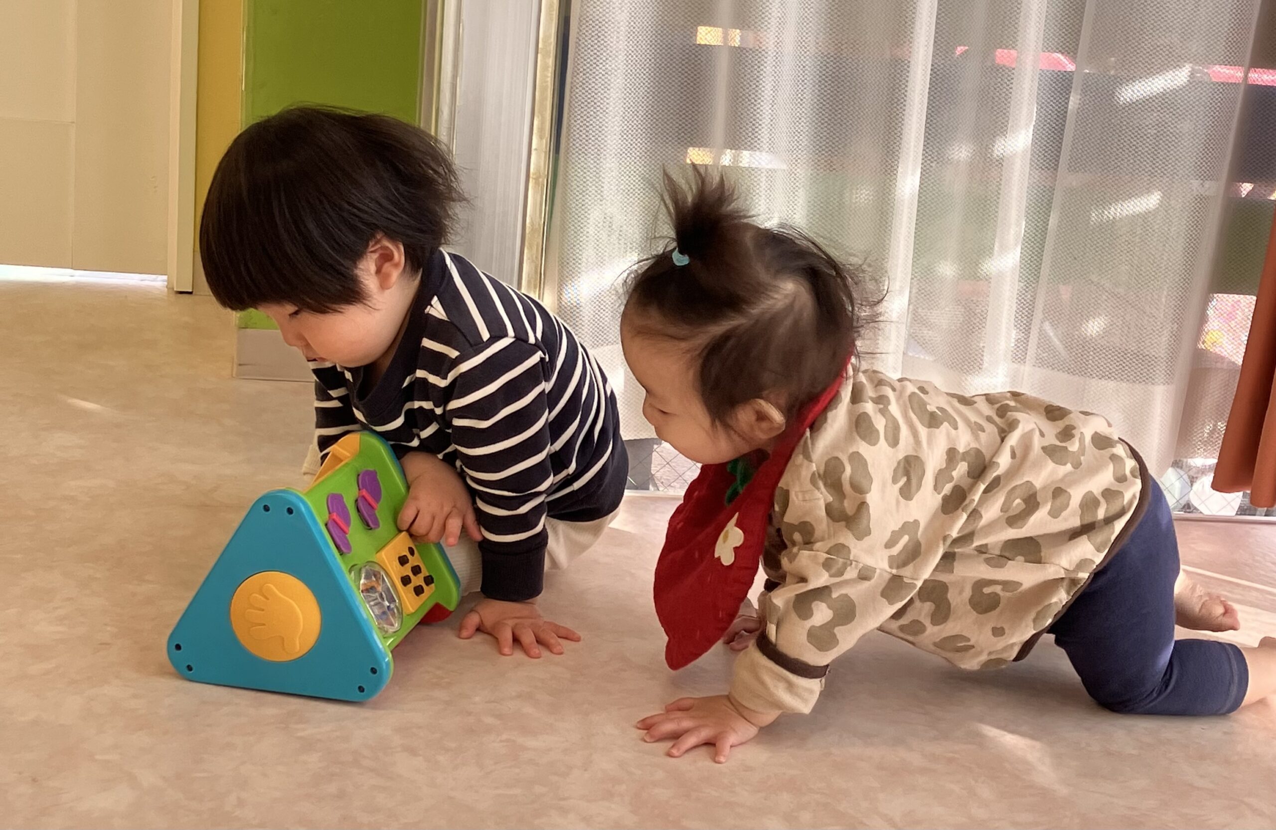 高月齢のお友達が低月齢のお友達におもちゃを貸してあげた