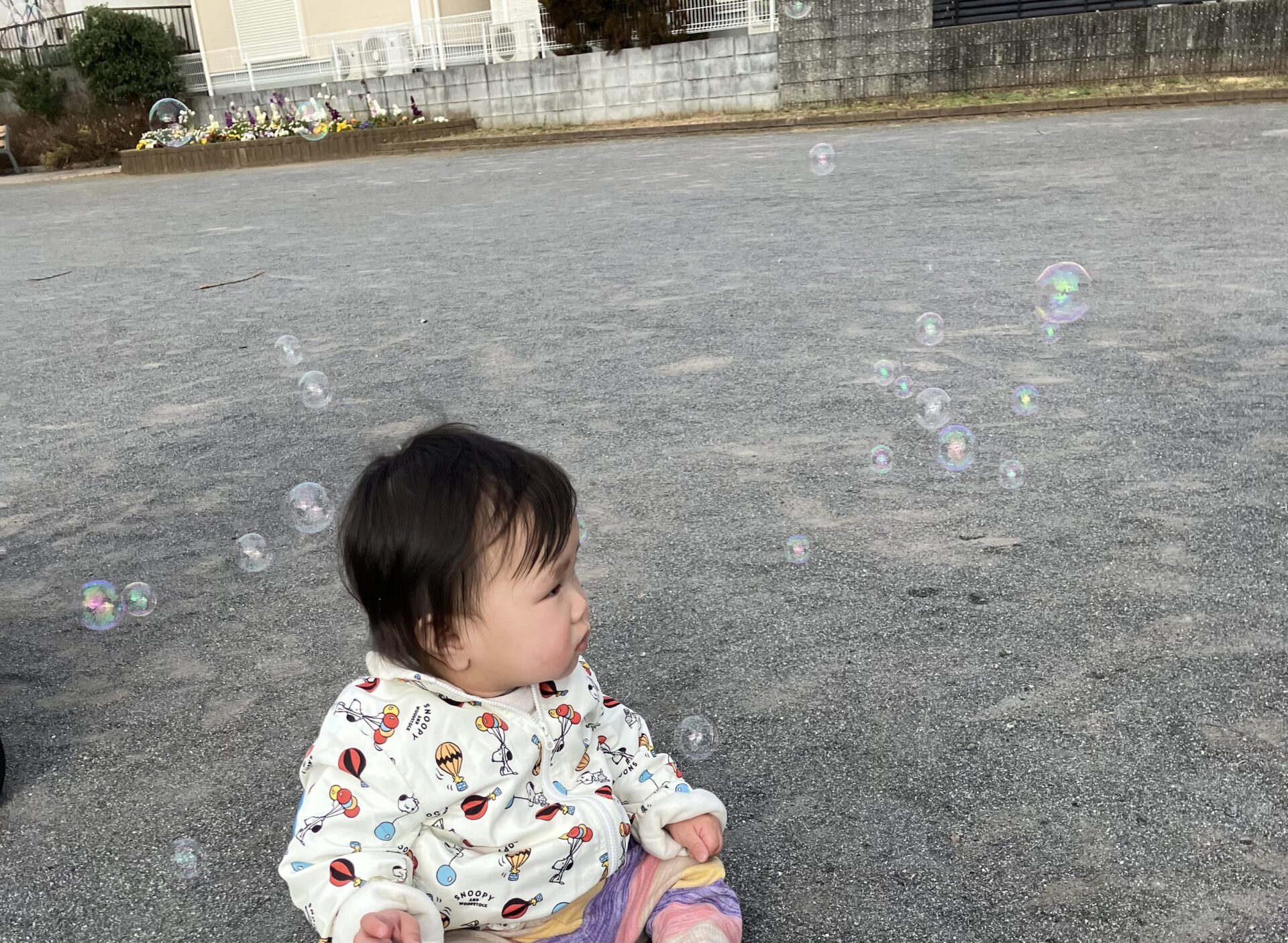 育者とおいかけっこをしたり、シャボン玉を追いかけ
