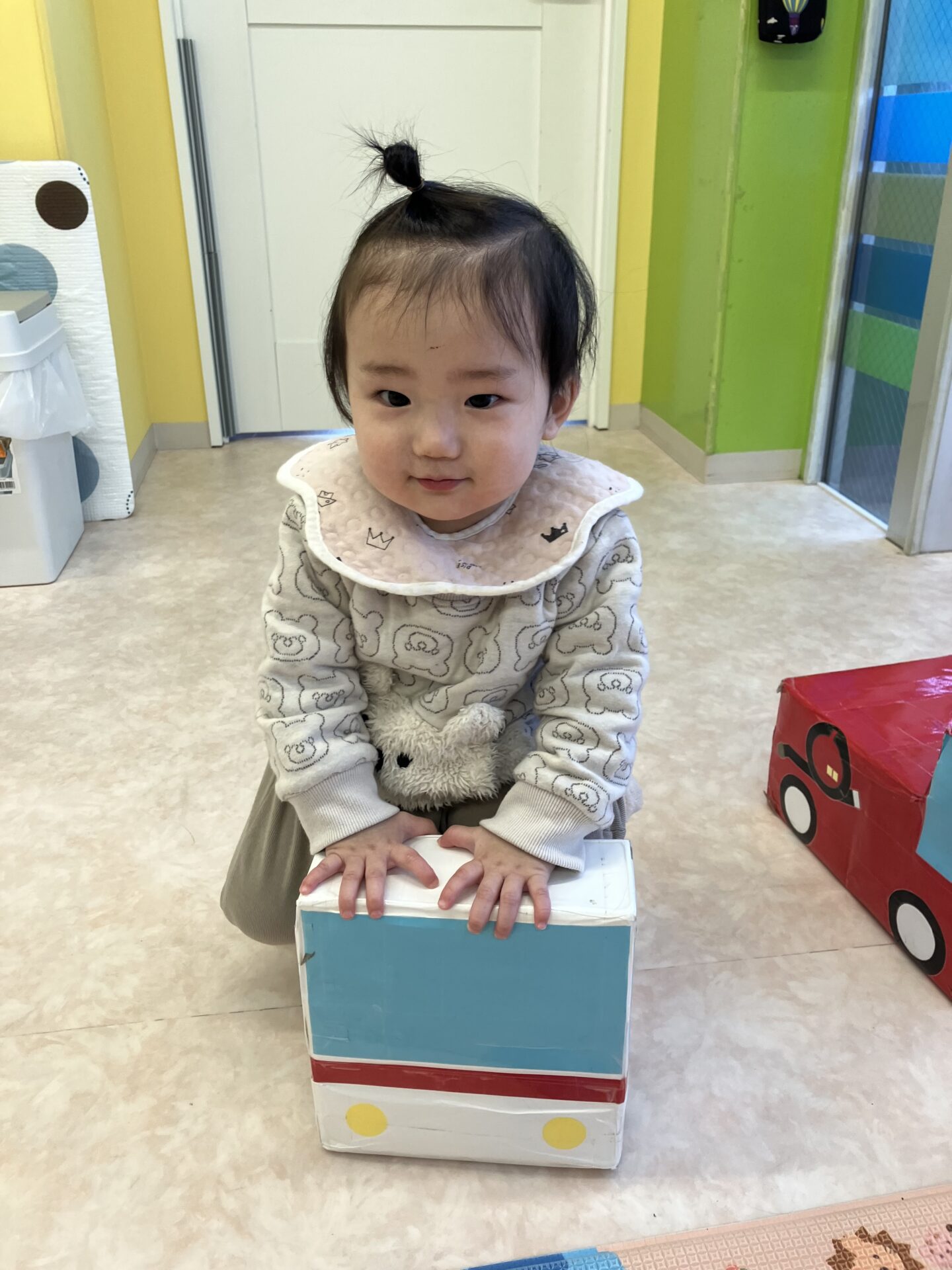 お部屋では車のおもちゃを走らせたり、時には乗ってみたり。