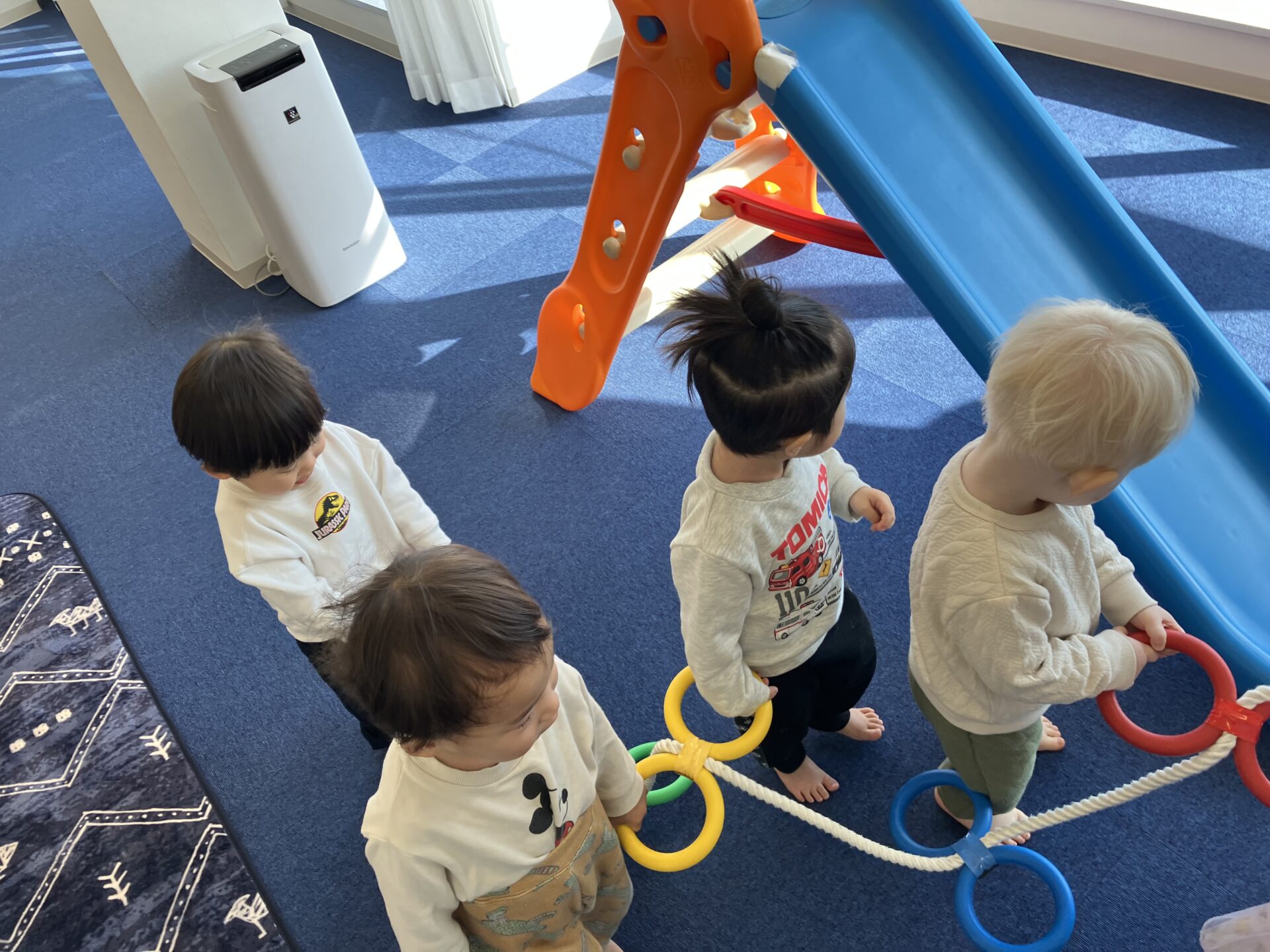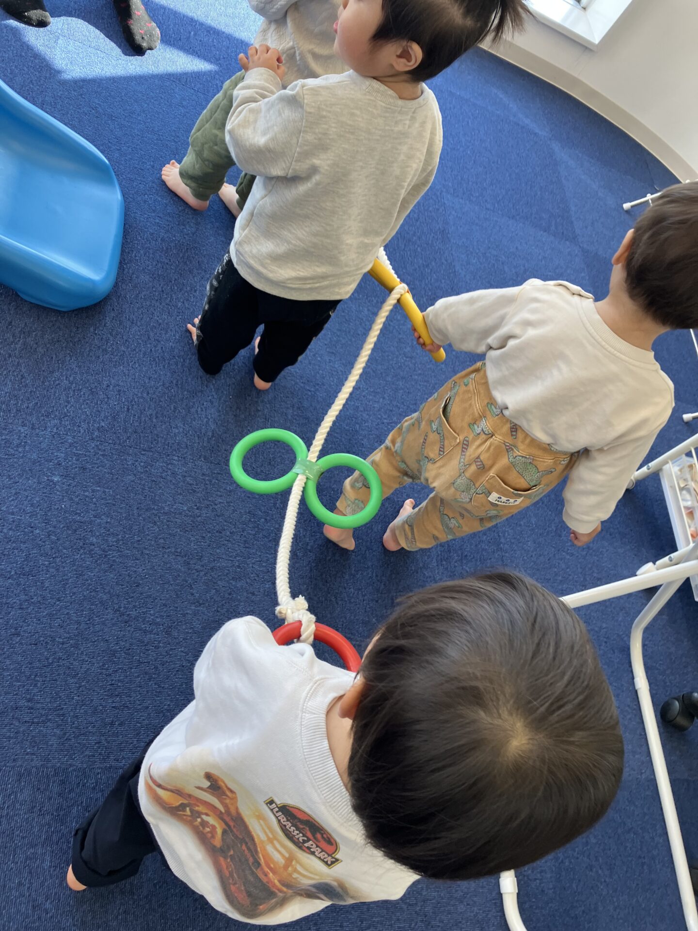 初めはロープのリングをどう持ったら良いのかわからず両手で持ったり、リングを手放す子がいたり、前にいるお友達を抜かそうとしたり…なかなかうまく歩けなかった子ども達でしたが、練習をしていくうちにとっても上手に歩けるようになりました。