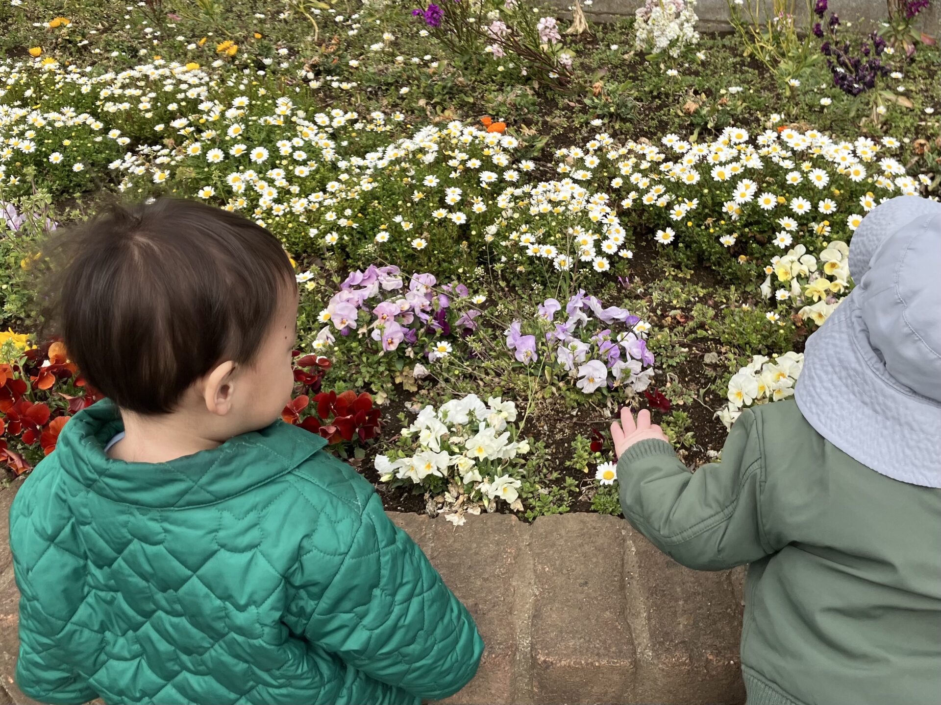花壇に咲いているお花を見つけて興味津々な子どもたち。