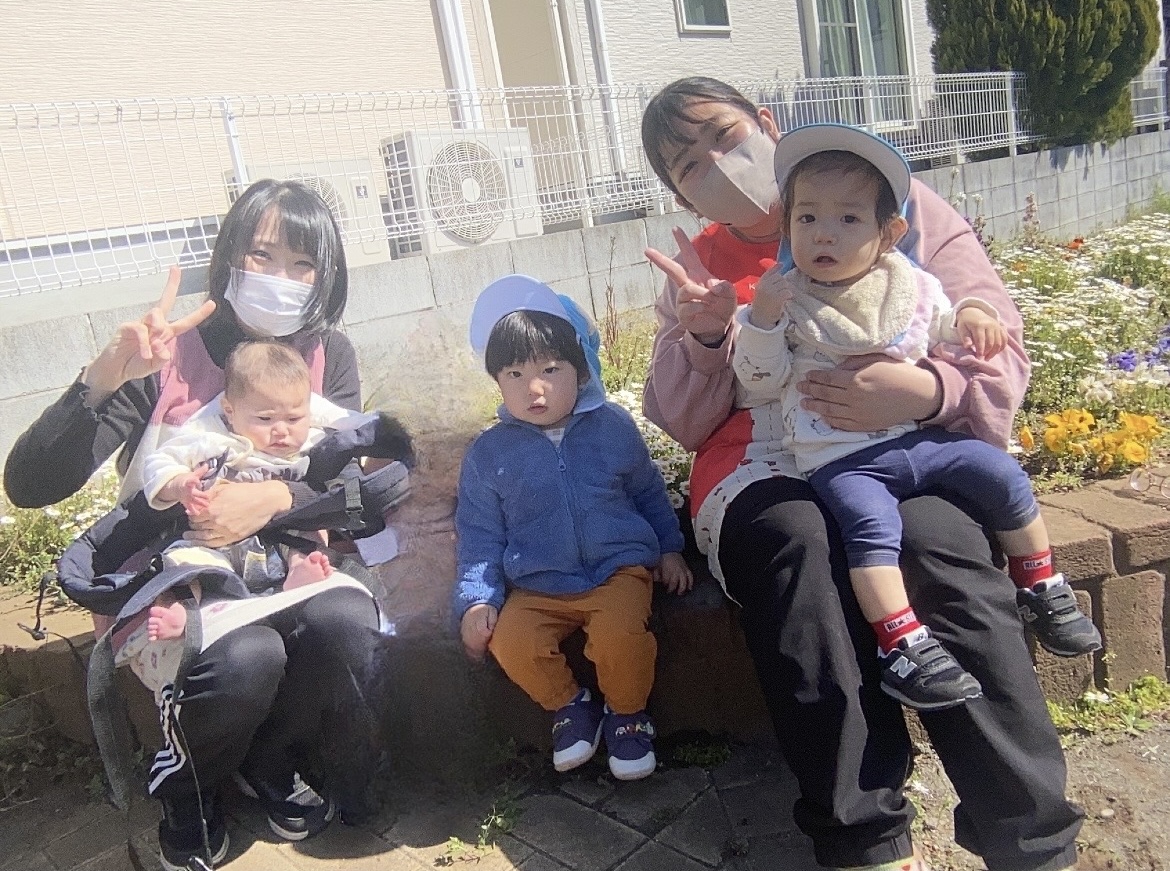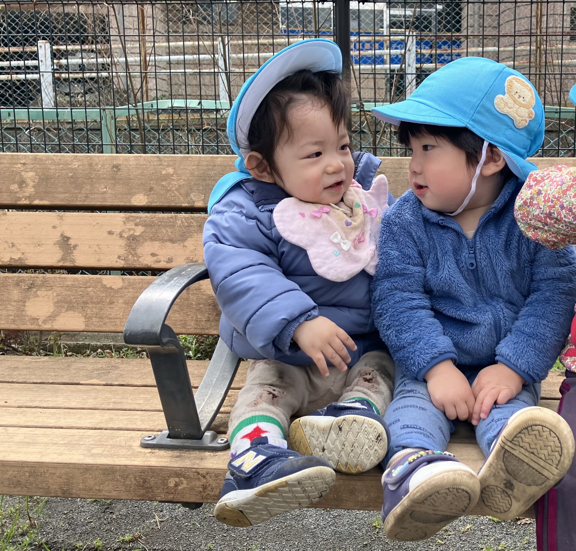 草花をツンツン触ってみたり、木の枝を見つけて砂にお絵描きをしたり、近くを車がよく走るので車を見たりするのが大好きなおんぷ組さんです。時々ベンチで休憩してみたり…
