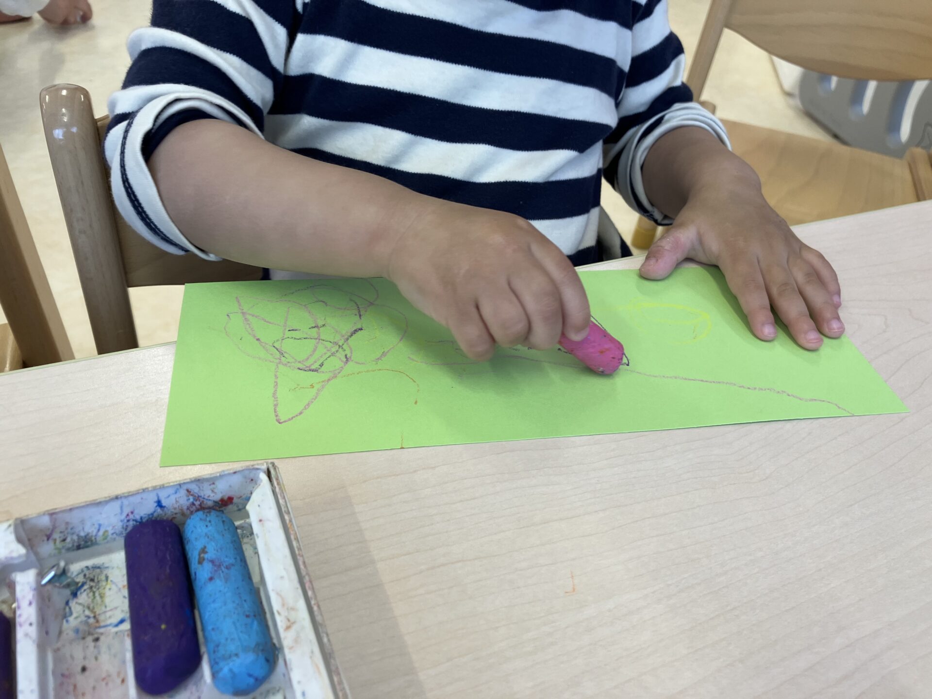 好きな色を選んで画用紙になぐり描きを楽しむ子どもたち。中には保育士の「お花描いてみて」の言葉を聞いて「みて!お花!」とニコニコ笑顔で見せてくれる子もいました。