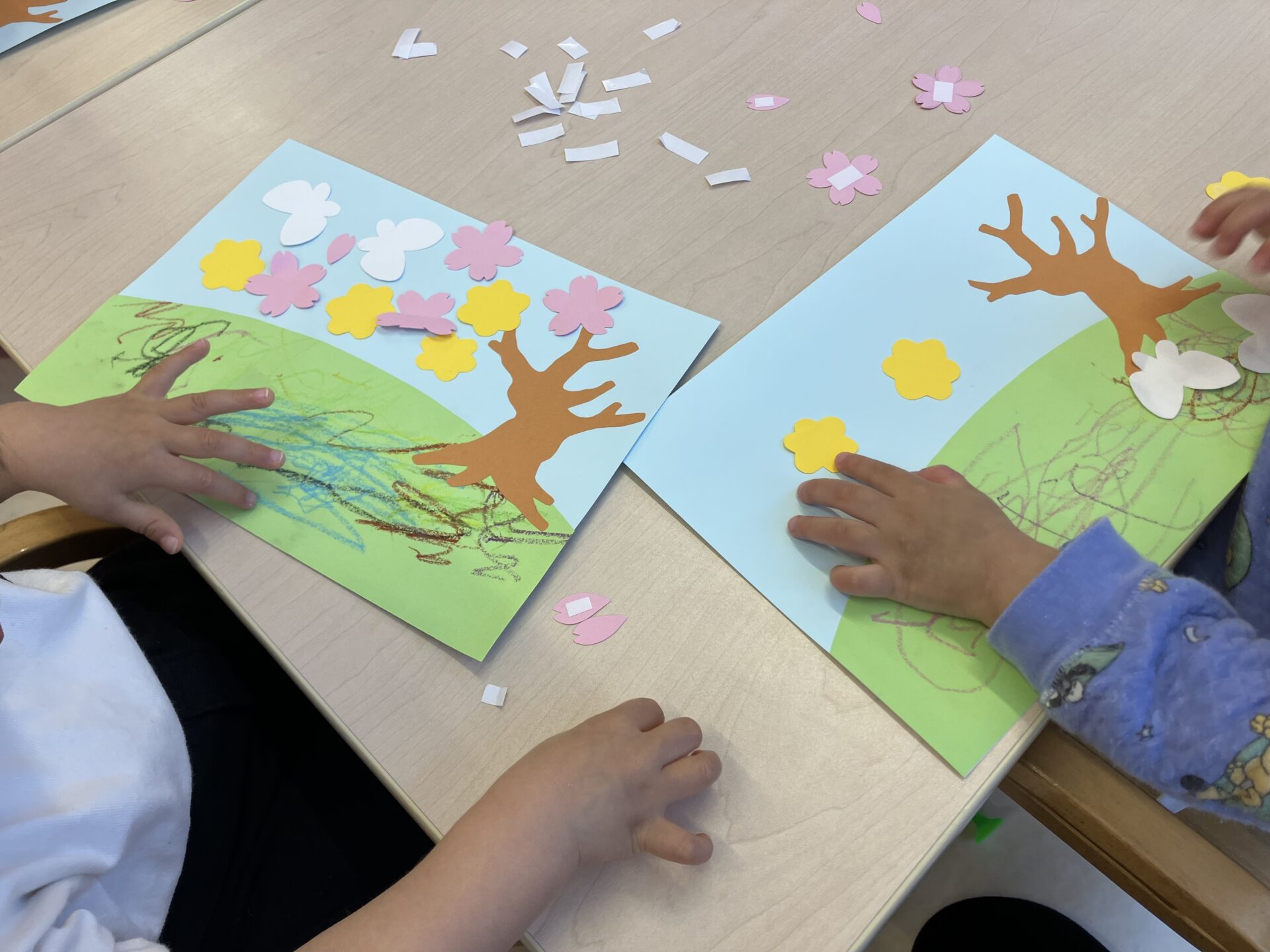 野原のお花を描いた後は、仕上げに桜や蝶々のシールをどこに貼ろうかな?と自分で考えながらペタペタと貼って完成!
